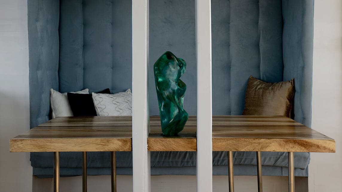 Expansive windows frame the seascape, while antiques, silk rugs, and art pieces reflect Indonesia’s rich cultural soul.