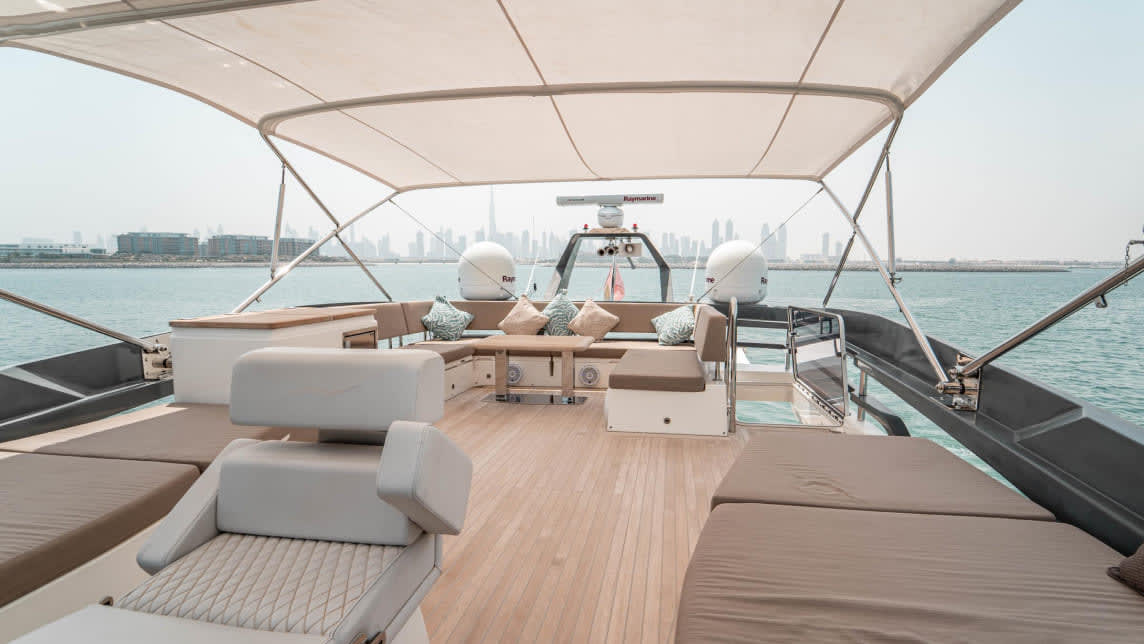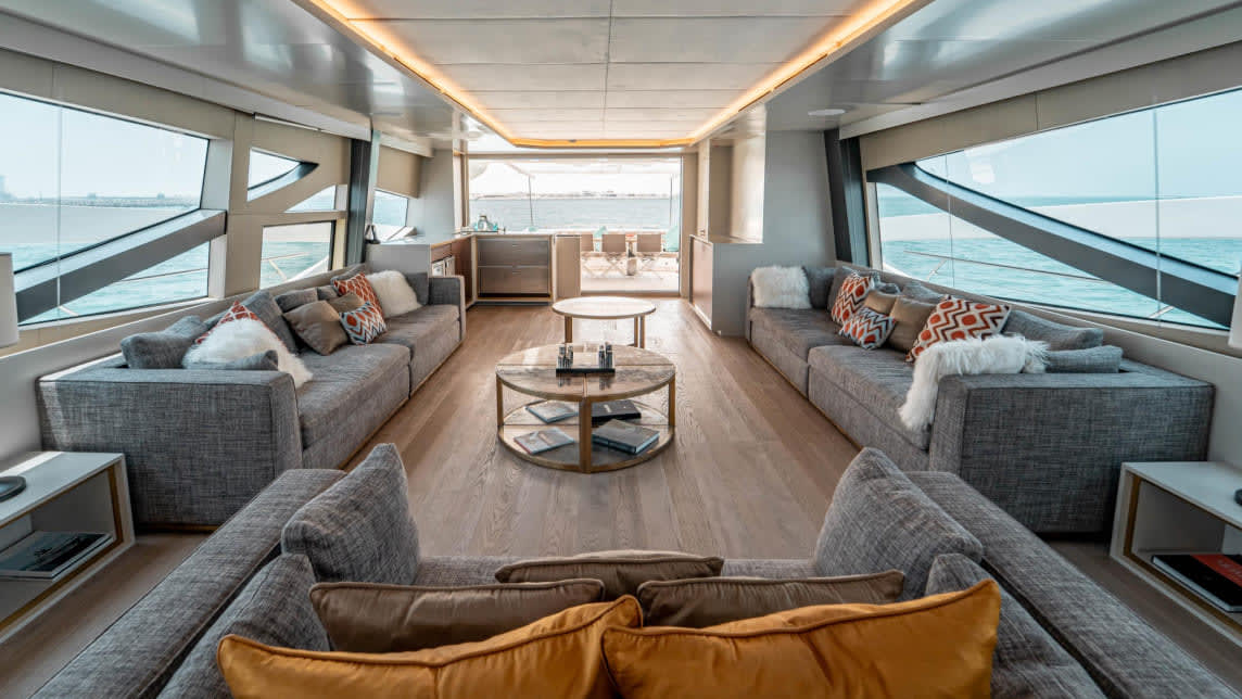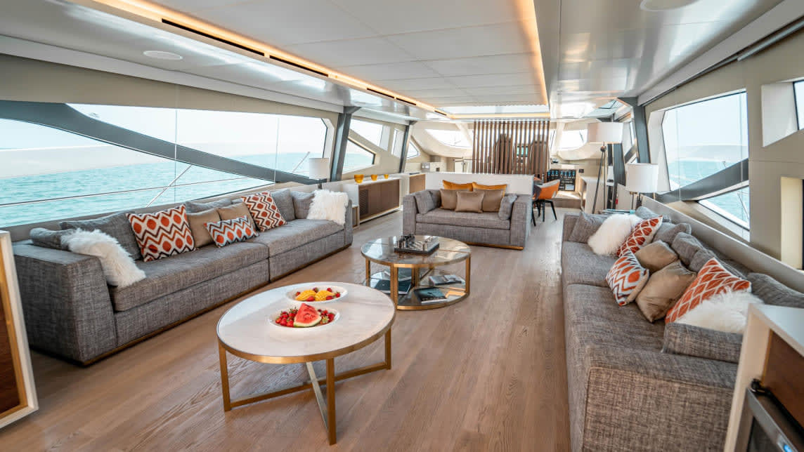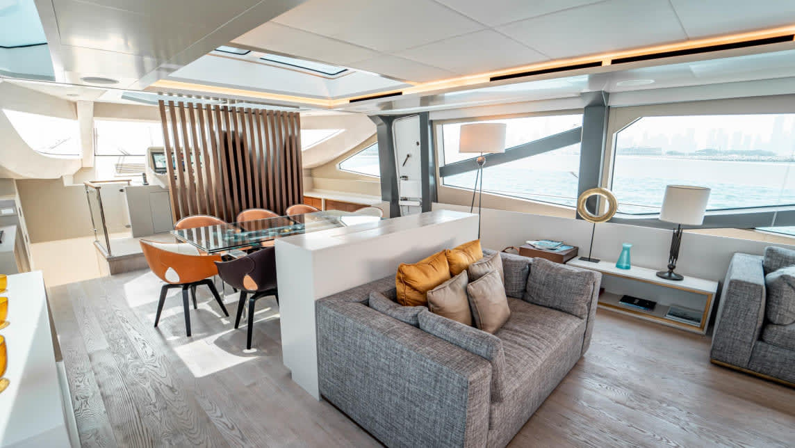 Large windows and open-plan spaces allow guests to enjoy panoramic views of the UAE, enhancing the on-board experience