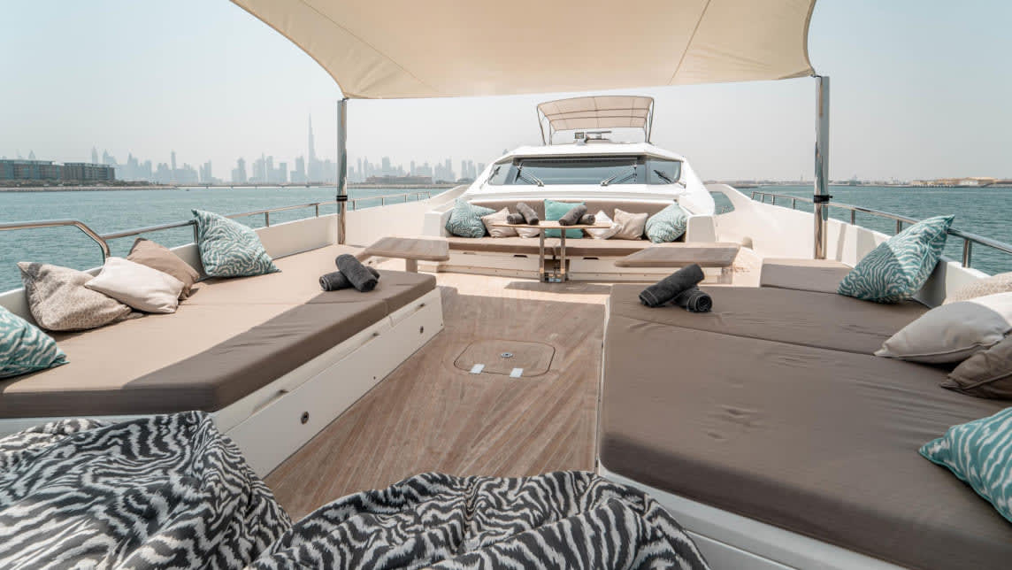 She can comfortably host up to 20 guests, making her an excellent choice for celebrations, corporate events, or simply a luxurious day at sea. Powered by powerful engines, she cruises at an impressive speed of 26 knots, ensuring a smooth and swift journey through the waters of the Arabian Gulf. For overnight stays, Dolce Vita accommodates up to 8 guests in 4 luxurious cabins, including a master suite, two VIP cabins, one double cabin and one twin cabin, offering comfort and privacy during longer charters.