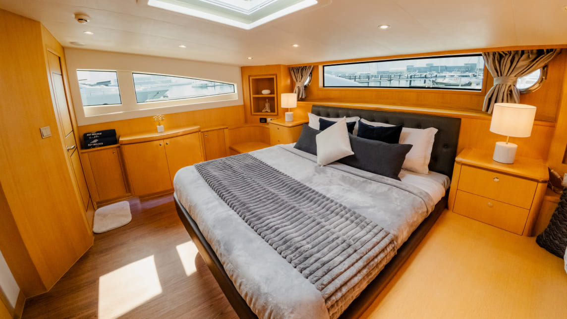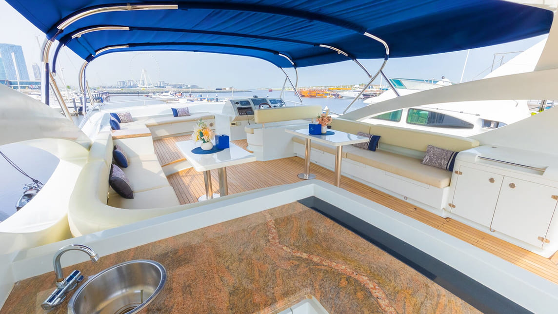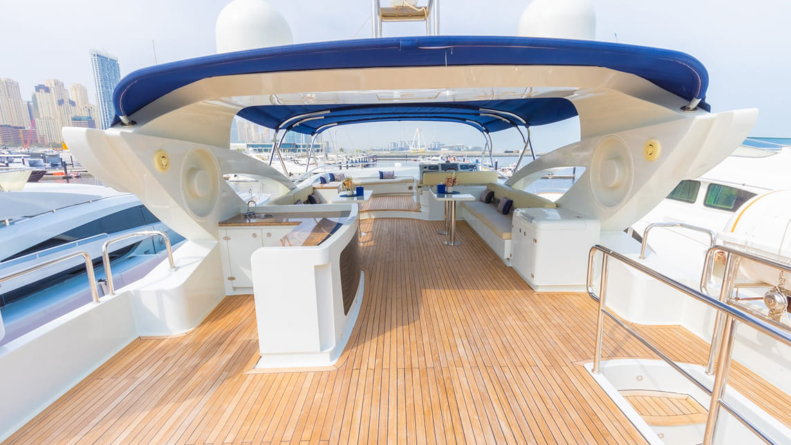 Powered by twin MTU engines, Kona offers smooth sailing and a luxurious cruising experience. She is available for charter in Dubai.