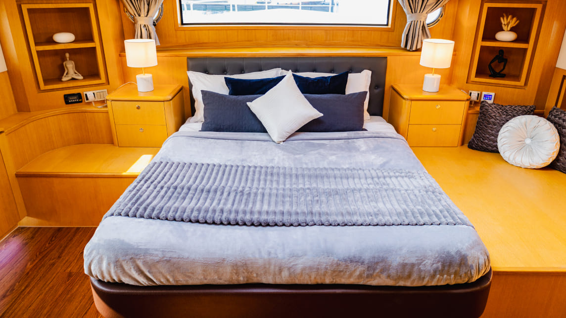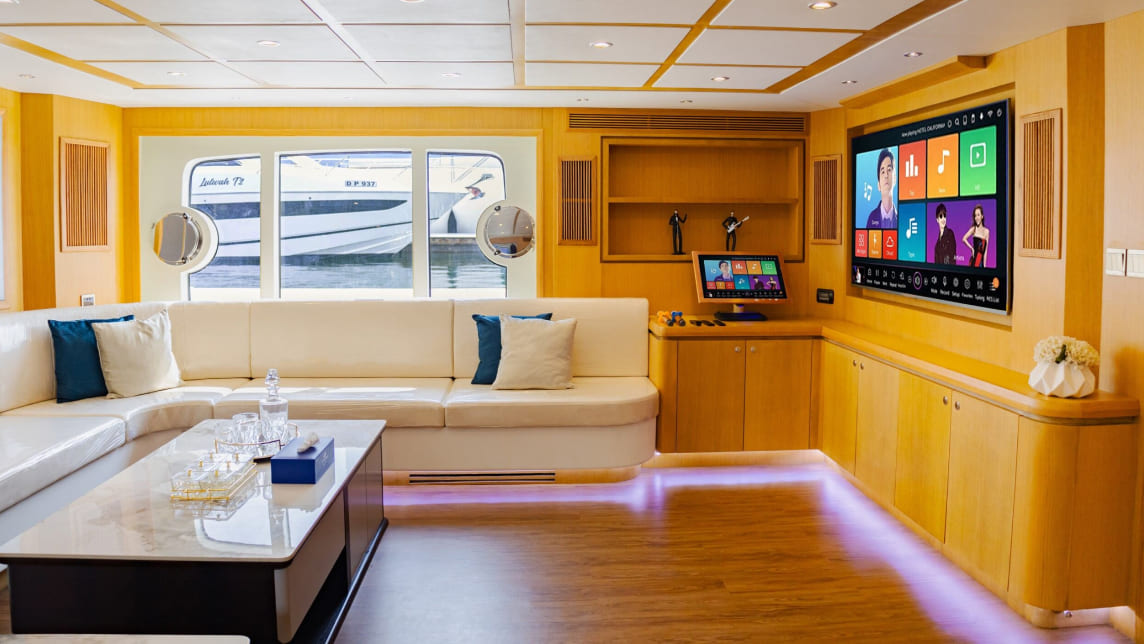 Kona boasts extensive deck space for entertaining and relaxation, including a spacious flybridge with a jacuzzi. Additional amenities include a private karaoke room and a large kitchen area, ideal for catered functions.