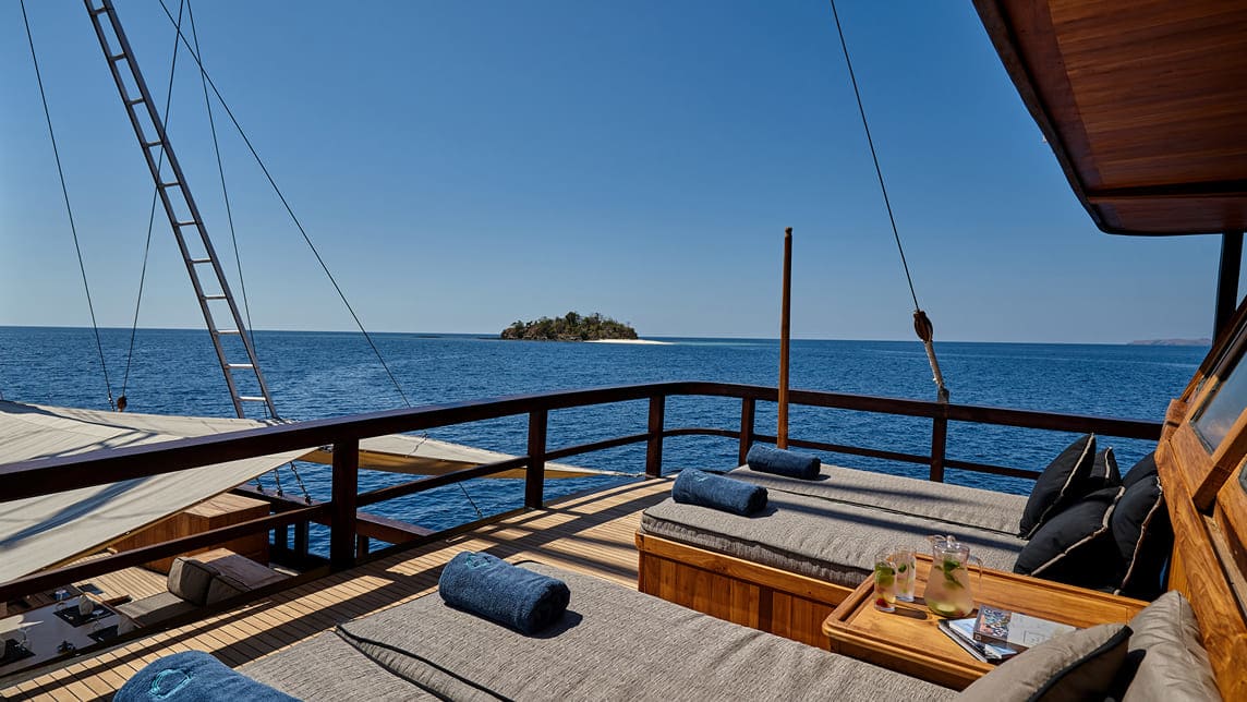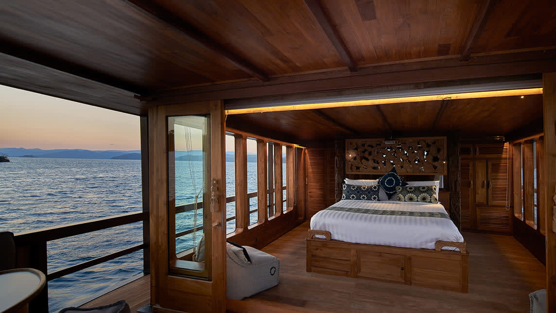 Two above-deck suites with ocean views and private terraces, plus a third versatile cabin for extra guests.