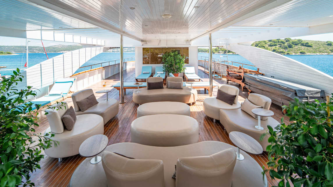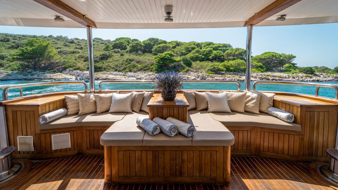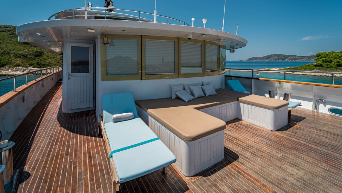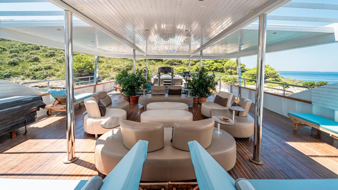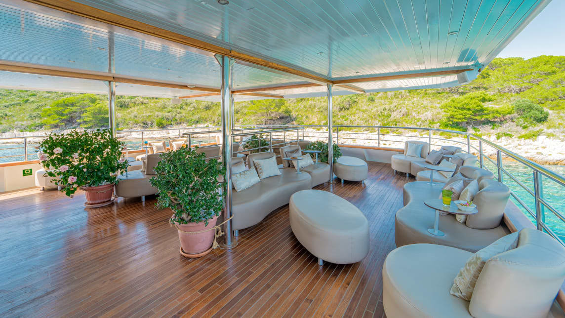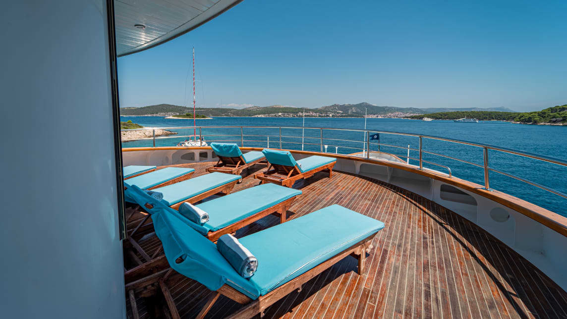 Perfect for large groups, she can accommodate up to 36 guests in 17 cabins, including 1 VIP cabin, 12 double cabins, 2 twin cabins and 2 triple cabins. RIVA features spacious decks all covered with burmese teak, making her more luxurious. In the sundeck, she has 30 deckchairs, a jacuzzi with panoramic views and a gym for those who want to continue their fitness routine on board.