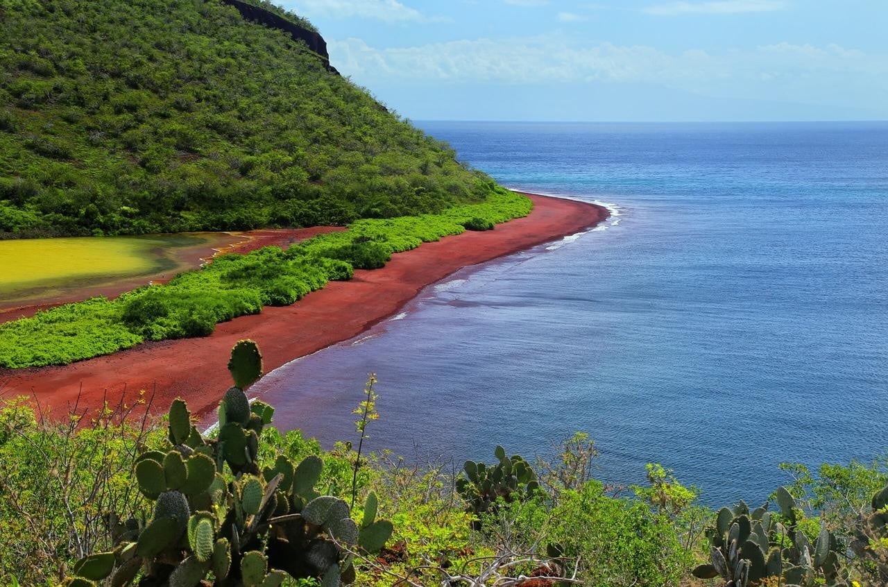 A gentle hike leads to a cliff viewpoint perfect for panoramic photography, while snorkelling here often brings encounters with reef sharks, rays, and vibrant fish. Rabida is also one of the best places to photograph pink flamingos feeding in the brackish lagoon, as well as pelicans and Galápagos penguins nearby.