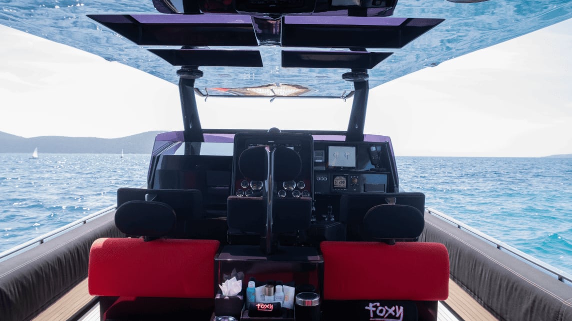 With a top speed of 48 knots, she delivers an exhilarating ride while accommodating up to 25 guests. The walk-around deck maximises space, featuring a large sunbed, a stylish lounge, and a dining area with panoramic sea views. A spacious swim platform ensures easy water access. The versatile bow transforms into a sunbed, dining space, or lounge, with retractable awnings for added comfort. Below deck, a day head offers convenience for day trips.